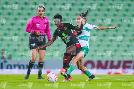 Torreón, Coahuila, 6 de octubre de 2025. Yessenia Novella y Grace Asantewaa, durante el partido correspondiente a la jornada 14 del torneo Apertura 2025 de la Liga BBVA MX Femenil, entre las Guerreras de Santos Laguna y las Bravas de FC Juárez, realizado en el estadio Corona. Foto: Imago7/ Saul Perales