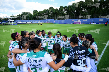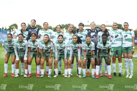 Ciudad de México, 11 de octubre de 2025. Foto de equipo de Santos, durante el partido correspondiente a la jornada 15 del torneo Apertura 2025 de la Liga BBVA MX Femenil, entre la Máquina Celeste del Cruz Azul y las Guerreras de Santos Laguna, realizado en La Noria. Foto: Imago7/ Carlos Vargas