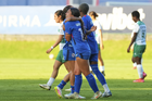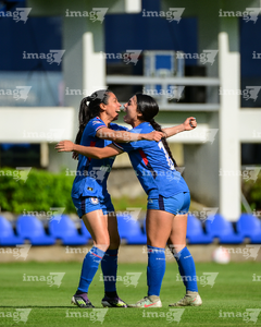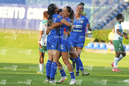 Ciudad de México, 11 de octubre de 2025. Jugadoras de Cruz Azul femenil en festejo de gol, durante el partido correspondiente a la jornada 15 del torneo Apertura 2025 de la Liga BBVA MX Femenil, entre la Máquina Celeste del Cruz Azul y las Guerreras de Santos Laguna, realizado en La Noria. Foto: Imago7/ Carlos Vargas
