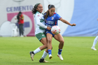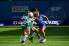 Ciudad de México, 11 de octubre de 2025. Leigh-anne Robe y Anahí Gómez, durante el partido correspondiente a la jornada 15 del torneo Apertura 2025 de la Liga BBVA MX Femenil, entre la Máquina Celeste del Cruz Azul y las Guerreras de Santos Laguna, realizado en La Noria. Foto: Imago7/ Alexis Chavez