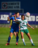 Ciudad de México, 11 de octubre de 2025. Yessenia Novella y Niomi Grimaldo, durante el partido correspondiente a la jornada 15 del torneo Apertura 2025 de la Liga BBVA MX Femenil, entre la Máquina Celeste del Cruz Azul y las Guerreras de Santos Laguna, realizado en La Noria. Foto: Imago7/ Alexis Chavez