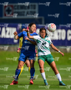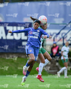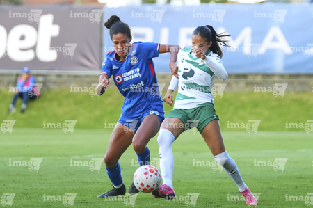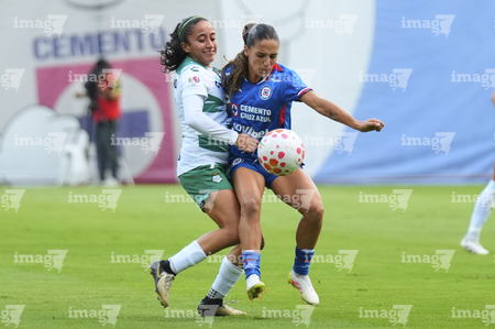 Ciudad de México, 11 de octubre de 2025. Aerial Chavarin y María Peraza, durante el partido correspondiente a la jornada 15 del torneo Apertura 2025 de la Liga BBVA MX Femenil, entre la Máquina Celeste del Cruz Azul y las Guerreras de Santos Laguna, realizado en La Noria. Foto: Imago7/ Alexis Chavez