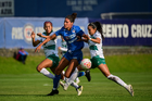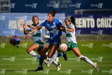 Ciudad de México, 11 de octubre de 2025. Karla Rodríguez, Aerial Chavarin y María Peraza, durante el partido correspondiente a la jornada 15 del torneo Apertura 2025 de la Liga BBVA MX Femenil, entre la Máquina Celeste del Cruz Azul y las Guerreras de Santos Laguna, realizado en La Noria. Foto: Imago7/ Alexis Chavez