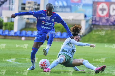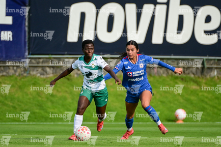 Ciudad de México, 11 de octubre de 2025. Sandra Nabweteme y Yaneisy Rodríguez, durante el partido correspondiente a la jornada 15 del torneo Apertura 2025 de la Liga BBVA MX Femenil, entre la Máquina Celeste del Cruz Azul y las Guerreras de Santos Laguna, realizado en La Noria. Foto: Imago7/ Alexis Chavez