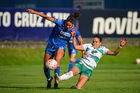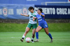 Ciudad de México, 11 de octubre de 2025. Doménica Rodríguez y Solange Lemos, durante el partido correspondiente a la jornada 15 del torneo Apertura 2025 de la Liga BBVA MX Femenil, entre la Máquina Celeste del Cruz Azul y las Guerreras de Santos Laguna, realizado en La Noria. Foto: Imago7/ Carlos Vargas