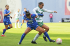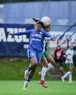 Ciudad de México, 11 de octubre de 2025. Deneisha Blackwood y Alexa Hernández, durante el partido correspondiente a la jornada 15 del torneo Apertura 2025 de la Liga BBVA MX Femenil, entre la Máquina Celeste del Cruz Azul y las Guerreras de Santos Laguna, realizado en La Noria. Foto: Imago7/ Carlos Vargas