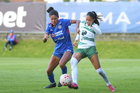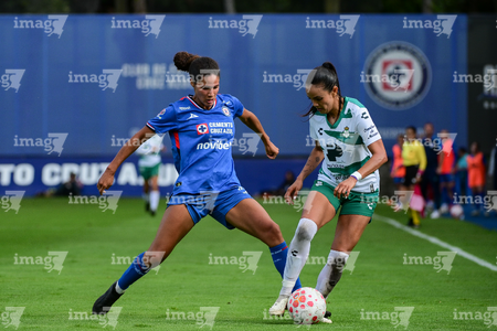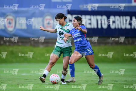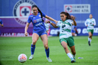 Ciudad de México, 11 de octubre de 2025. Danya Gutiérrez y Michel Ruiz, durante el partido correspondiente a la jornada 15 del torneo Apertura 2025 de la Liga BBVA MX Femenil, entre la Máquina Celeste del Cruz Azul y las Guerreras de Santos Laguna, realizado en La Noria. Foto: Imago7/ Alexis Chavez