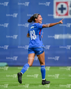 Ciudad de México, 11 de octubre de 2025. Aerial Chavarin en festejo de gol, durante el partido correspondiente a la jornada 15 del torneo Apertura 2025 de la Liga BBVA MX Femenil, entre la Máquina Celeste del Cruz Azul y las Guerreras de Santos Laguna, realizado en La Noria. Foto: Imago7/ Alexis Chavez