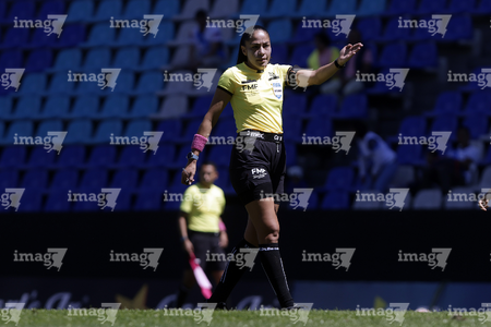 Puebla, Puebla, 19 de octubre de 2025. Priscila Pérez Borja, árbitra central, durante el partido correspondiente a la jornada 16 del torneo Apertura 2025 de la Liga BBVA MX Femenil, entre el Club Puebla y las Xolas de Tijuana, realizado en el estadio Cuauhtémoc. Foto: Imago7/ Mireya Novo