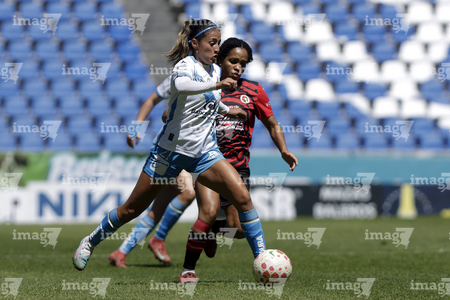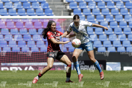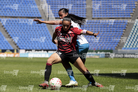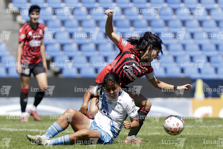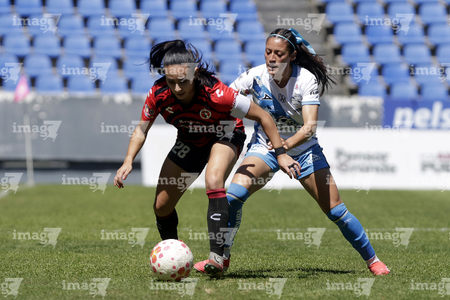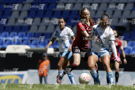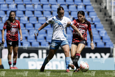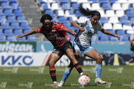 Puebla, Puebla, 19 de octubre de 2025. Rubí Villegas y Danielle Fuentes, durante el partido correspondiente a la jornada 16 del torneo Apertura 2025 de la Liga BBVA MX Femenil, entre el Club Puebla y las Xolas de Tijuana, realizado en el estadio Cuauhtémoc. Foto: Imago7/ Mireya Novo