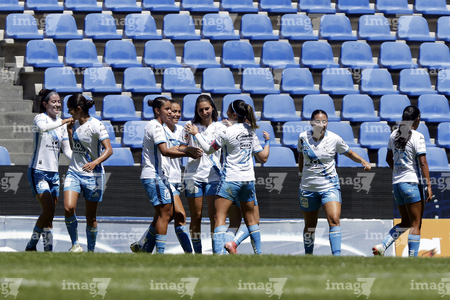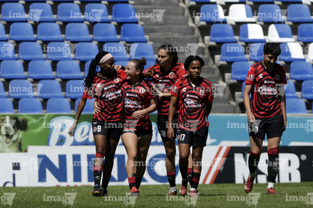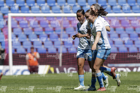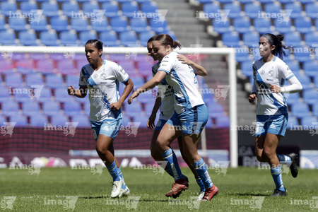 Puebla, Puebla, 19 de octubre de 2025. Jugadoras del Puebla femenil en festejo de gol, durante el partido correspondiente a la jornada 16 del torneo Apertura 2025 de la Liga BBVA MX Femenil, entre el Club Puebla y las Xolas de Tijuana, realizado en el estadio Cuauhtémoc. Foto: Imago7/ Mireya Novo