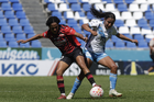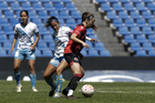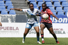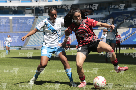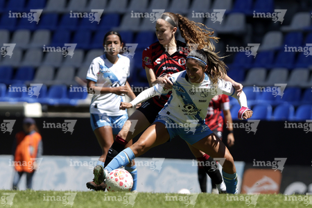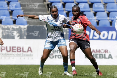 Puebla, Puebla, 19 de octubre de 2025. Amogelang Motau y Cynthia Rodríguez, durante el partido correspondiente a la jornada 16 del torneo Apertura 2025 de la Liga BBVA MX Femenil, entre el Club Puebla y las Xolas de Tijuana, realizado en el estadio Cuauhtémoc. Foto: Imago7/ Mireya Novo