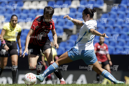 Puebla, Puebla, 19 de octubre de 2025. Deisy Ojeda y Luisa De Alba, durante el partido correspondiente a la jornada 16 del torneo Apertura 2025 de la Liga BBVA MX Femenil, entre el Club Puebla y las Xolas de Tijuana, realizado en el estadio Cuauhtémoc. Foto: Imago7/ Mireya Novo