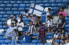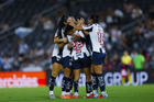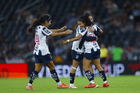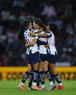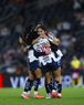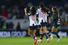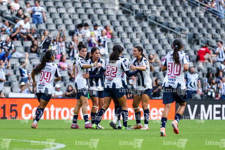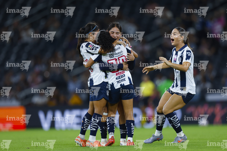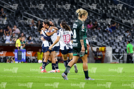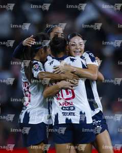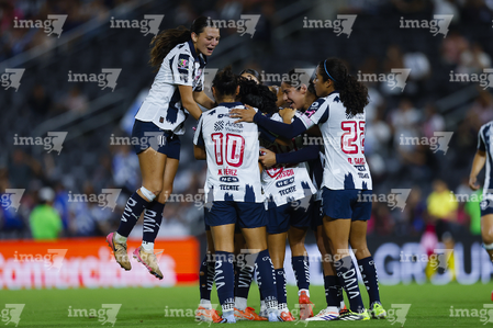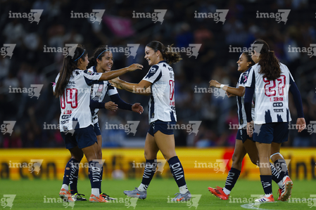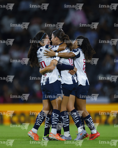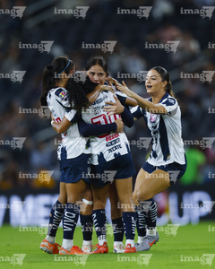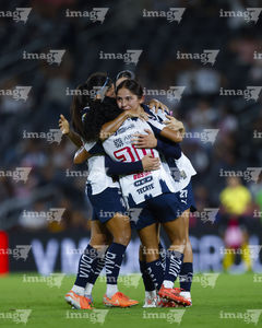 Guadalupe, Nuevo León, 19 de octubre de 2025. Jugadoras de Rayadas en festejo de gol, durante el partido correspondiente a la jornada 16 del torneo Apertura 2025 de la Liga BBVA MX Femenil, entre las Rayadas del Monterrey y las Esmeraldas del León, realizado en el estadio BBVA. Foto: Imago7/ Nora Guerero