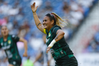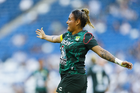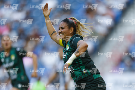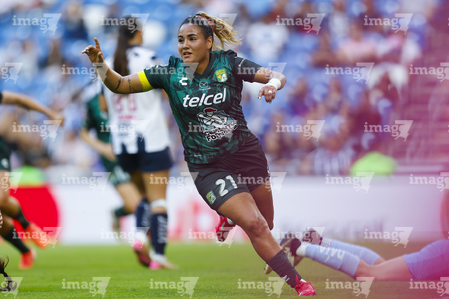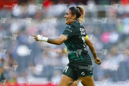 Guadalupe, Nuevo León, 19 de octubre de 2025. Alexia Villanueva en festejo de gol, durante el partido correspondiente a la jornada 16 del torneo Apertura 2025 de la Liga BBVA MX Femenil, entre las Rayadas del Monterrey y las Esmeraldas del León, realizado en el estadio BBVA. Foto: Imago7/