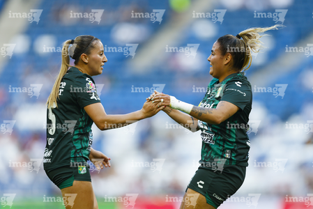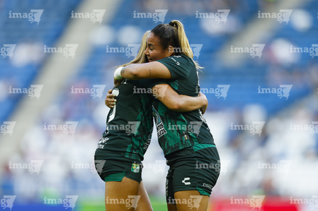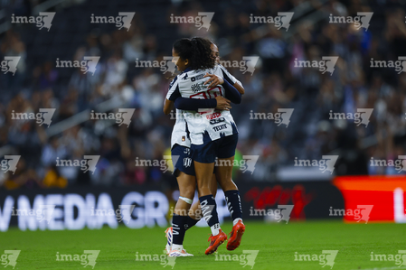 Guadalupe, Nuevo León, 19 de octubre de 2025. Rubí Soto y Alexia Villanueva en festejo de gol, durante el partido correspondiente a la jornada 16 del torneo Apertura 2025 de la Liga BBVA MX Femenil, entre las Rayadas del Monterrey y las Esmeraldas del León, realizado en el estadio BBVA. Foto: Imago7/