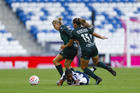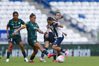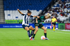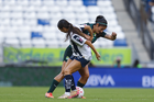 Guadalupe, Nuevo León, 19 de octubre de 2025. Jermaine Seoposenwe y Natalia Acuña, durante el partido correspondiente a la jornada 16 del torneo Apertura 2025 de la Liga BBVA MX Femenil, entre las Rayadas del Monterrey y las Esmeraldas del León, realizado en el estadio BBVA. Foto: Imago7/