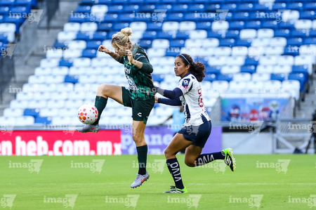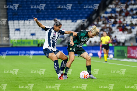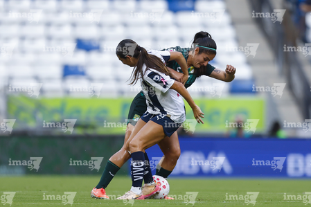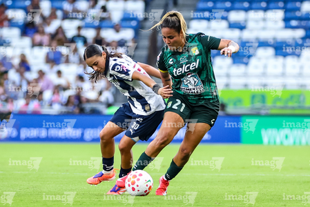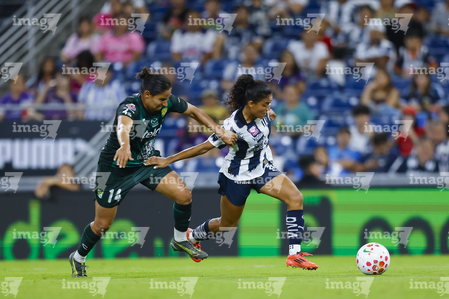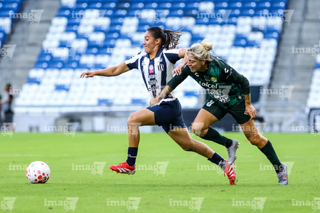 Guadalupe, Nuevo León, 19 de octubre de 2025. Alexia Villanueva y Diana García, durante el partido correspondiente a la jornada 16 del torneo Apertura 2025 de la Liga BBVA MX Femenil, entre las Rayadas del Monterrey y las Esmeraldas del León, realizado en el estadio BBVA. Foto: Imago7/