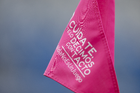 Guadalupe, Nuevo León, 19 de octubre de 2025. Banderin de tiro de esquina de la Campaña Rosa para la concientización del Cáncer de Mama, durante el partido correspondiente a la jornada 16 del torneo Apertura 2025 de la Liga BBVA MX Femenil, entre las Rayadas del Monterrey y las Esmeraldas del León, realizado en el estadio BBVA. Foto: Imago7/