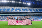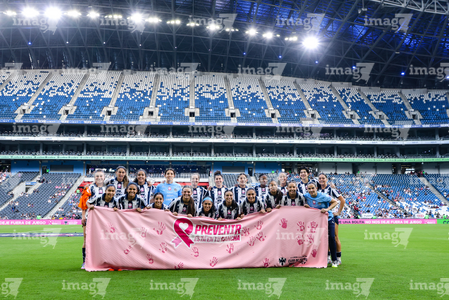 Guadalupe, Nuevo León, 19 de octubre de 2025. Jugadoras de Rayadas con manta de la Campaña Rosa para la concientización del Cáncer de Mama, durante el partido correspondiente a la jornada 16 del torneo Apertura 2025 de la Liga BBVA MX Femenil, entre las Rayadas del Monterrey y las Esmeraldas del León, realizado en el estadio BBVA. Foto: Imago7/ Nora Guerero