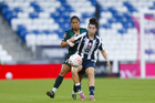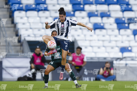 Guadalupe, Nuevo León, 19 de octubre de 2025. Nicole Pérez y Ruth Bravo, durante el partido correspondiente a la jornada 16 del torneo Apertura 2025 de la Liga BBVA MX Femenil, entre las Rayadas del Monterrey y las Esmeraldas del León, realizado en el estadio BBVA. Foto: Imago7/ Nora Guerero
