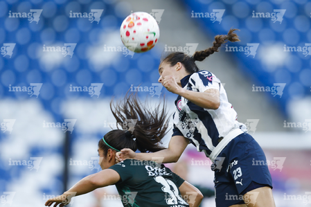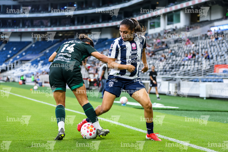 Guadalupe, Nuevo León, 19 de octubre de 2025. Daniela Monroy y Ruth Bravo, durante el partido correspondiente a la jornada 16 del torneo Apertura 2025 de la Liga BBVA MX Femenil, entre las Rayadas del Monterrey y las Esmeraldas del León, realizado en el estadio BBVA. Foto: Imago7/ Nora Guerero
