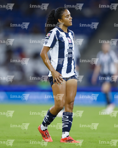 Guadalupe, Nuevo León, 19 de octubre de 2025. Mayalu Rausch, durante el partido correspondiente a la jornada 16 del torneo Apertura 2025 de la Liga BBVA MX Femenil, entre las Rayadas del Monterrey y las Esmeraldas del León, realizado en el estadio BBVA. Foto: Imago7/