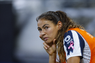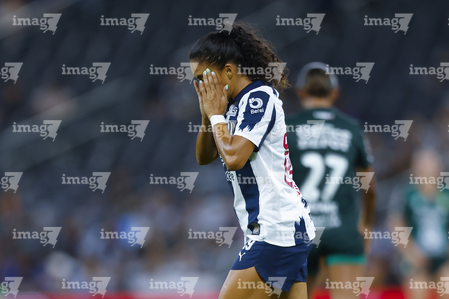 Guadalupe, Nuevo León, 19 de octubre de 2025. Paola Manrique en lamento, durante el partido correspondiente a la jornada 16 del torneo Apertura 2025 de la Liga BBVA MX Femenil, entre las Rayadas del Monterrey y las Esmeraldas del León, realizado en el estadio BBVA. Foto: Imago7/