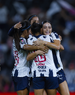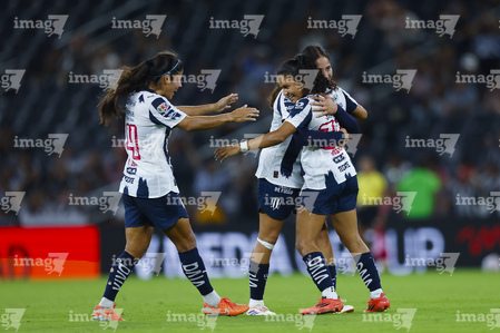 Guadalupe, Nuevo León, 19 de octubre de 2025. Alejandra Lua, Fátima Servín y Lourdes Bosch en festejo de gol, durante el partido correspondiente a la jornada 16 del torneo Apertura 2025 de la Liga BBVA MX Femenil, entre las Rayadas del Monterrey y las Esmeraldas del León, realizado en el estadio BBVA. Foto: Imago7/