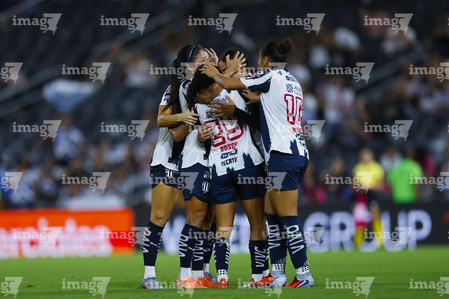 Guadalupe, Nuevo León, 19 de octubre de 2025. Jugadoras de Rayadas en festejo de gol, durante el partido correspondiente a la jornada 16 del torneo Apertura 2025 de la Liga BBVA MX Femenil, entre las Rayadas del Monterrey y las Esmeraldas del León, realizado en el estadio BBVA. Foto: Imago7/
