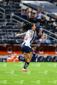 Guadalupe, Nuevo León, 19 de octubre de 2025. Allison Veloz en festejo de gol, durante el partido correspondiente a la jornada 16 del torneo Apertura 2025 de la Liga BBVA MX Femenil, entre las Rayadas del Monterrey y las Esmeraldas del León, realizado en el estadio BBVA. Foto: Imago7/