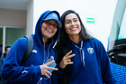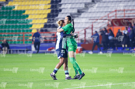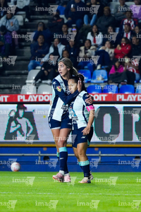 Pachuca, Hidalgo, 19 de octubre de 2025. Daniela Flores y Esthefanny Barreras en festejo, durante el partido correspondiente a la jornada 16 del torneo Apertura 2025 de la Liga BBVA MX Femenil, entre las Tuzas del Pachuca y las Chivas Rayadas del Guadalajara, realizado en el estadio Hidalgo. Foto: Imago7/ Elizabeth Hernández