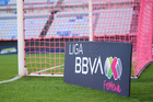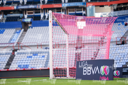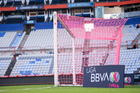 Pachuca, Hidalgo, 19 de octubre de 2025. Red de portería de la Campaña Rosa para la concientización del Cáncer de Mama, durante el partido correspondiente a la jornada 16 del torneo Apertura 2025 de la Liga BBVA MX Femenil, entre las Tuzas del Pachuca y las Chivas Rayadas del Guadalajara, realizado en el estadio Hidalgo. Foto: Imago7/ Elizabeth Hernández