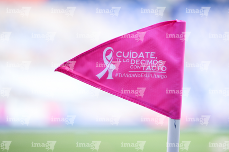 Pachuca, Hidalgo, 19 de octubre de 2025. Banderin de tiro de esquina de la Campaña Rosa para la concientización del Cáncer de Mama, durante el partido correspondiente a la jornada 16 del torneo Apertura 2025 de la Liga BBVA MX Femenil, entre las Tuzas del Pachuca y las Chivas Rayadas del Guadalajara, realizado en el estadio Hidalgo. Foto: Imago7/ Elizabeth Hernández