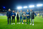 Pachuca, Hidalgo, 19 de octubre de 2025. Jugadoras de Tuzas y Óscar Torres, director técnico, Charlyn Corral y Esthefanny Barreras quienes recibieron sus balones de oro, durante el partido correspondiente a la jornada 16 del torneo Apertura 2025 de la Liga BBVA MX Femenil, entre las Tuzas del Pachuca y las Chivas Rayadas del Guadalajara, realizado en el estadio Hidalgo. Foto: Imago7/ Jacqueline Pedraza