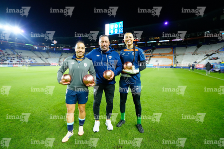 Pachuca, Hidalgo, 19 de octubre de 2025. Óscar Torres, director técnico, Charlyn Corral y Esthefanny Barreras quienes recibieron sus balones de oro, durante el partido correspondiente a la jornada 16 del torneo Apertura 2025 de la Liga BBVA MX Femenil, entre las Tuzas del Pachuca y las Chivas Rayadas del Guadalajara, realizado en el estadio Hidalgo. Foto: Imago7/ Jacqueline Pedraza