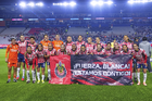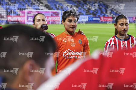 Pachuca, Hidalgo, 19 de octubre de 2025. Foto de equipo de Chivas Femenil con manta en apoyo a Blanca, durante el partido correspondiente a la jornada 16 del torneo Apertura 2025 de la Liga BBVA MX Femenil, entre las Tuzas del Pachuca y las Chivas Rayadas del Guadalajara, realizado en el estadio Hidalgo. Foto: Imago7/ Manlio Contreras