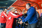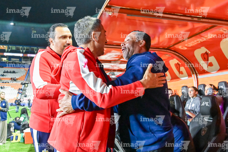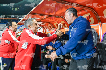 Pachuca, Hidalgo, 19 de octubre de 2025. Antonio Contreras, director técnico y Óscar Torres, director técnico, durante el partido correspondiente a la jornada 16 del torneo Apertura 2025 de la Liga BBVA MX Femenil, entre las Tuzas del Pachuca y las Chivas Rayadas del Guadalajara, realizado en el estadio Hidalgo. Foto: Imago7/ Mauricio Ruiz