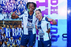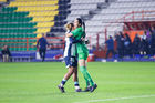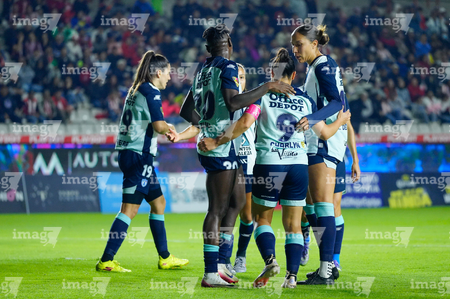 Pachuca, Hidalgo, 19 de octubre de 2025. Charlyn Corral y Ayooluwa Oke , durante el partido correspondiente a la jornada 16 del torneo Apertura 2025 de la Liga BBVA MX Femenil, entre las Tuzas del Pachuca y las Chivas Rayadas del Guadalajara, realizado en el estadio Hidalgo. Foto: Imago7/ Mauricio Ruizen festejo de gol