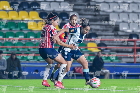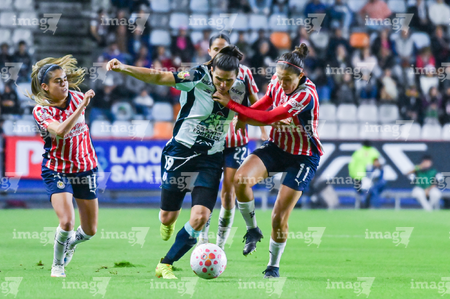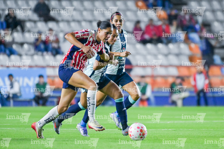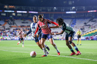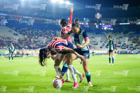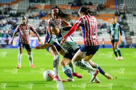 Pachuca, Hidalgo, 19 de octubre de 2025. Damaris Godínez, Charlyn Corral y Gabriela Valenzuela, durante el partido correspondiente a la jornada 16 del torneo Apertura 2025 de la Liga BBVA MX Femenil, entre las Tuzas del Pachuca y las Chivas Rayadas del Guadalajara, realizado en el estadio Hidalgo. Foto: Imago7/ Jacqueline Pedraza