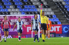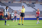 Pachuca, Hidalgo, 19 de octubre de 2025. Itzel Hernández Fuentes, árbitra central, durante el partido correspondiente a la jornada 16 del torneo Apertura 2025 de la Liga BBVA MX Femenil, entre las Tuzas del Pachuca y las Chivas Rayadas del Guadalajara, realizado en el estadio Hidalgo. Foto: Imago7/ Manlio Contreras