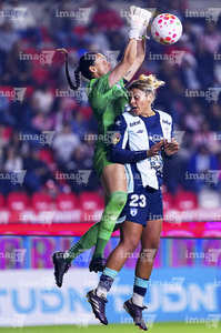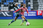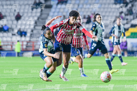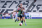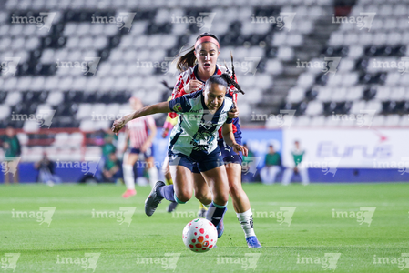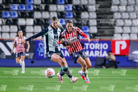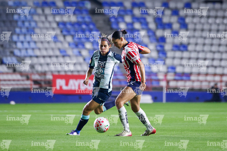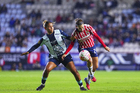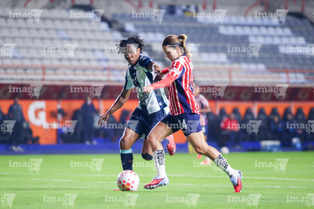Pachuca, Hidalgo, 19 de octubre de 2025. Charlyn Corral y Casandra Montero, durante el partido correspondiente a la jornada 16 del torneo Apertura 2025 de la Liga BBVA MX Femenil, entre las Tuzas del Pachuca y las Chivas Rayadas del Guadalajara, realizado en el estadio Hidalgo. Foto: Imago7/ Mauricio Ruiz