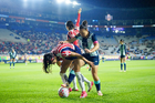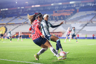 Pachuca, Hidalgo, 19 de octubre de 2025. Andrea Pereira y Yamile Franco, durante el partido correspondiente a la jornada 16 del torneo Apertura 2025 de la Liga BBVA MX Femenil, entre las Tuzas del Pachuca y las Chivas Rayadas del Guadalajara, realizado en el estadio Hidalgo. Foto: Imago7/ Mauricio Ruiz