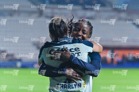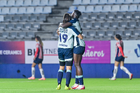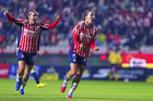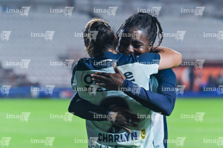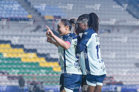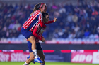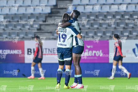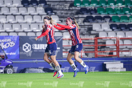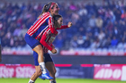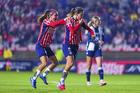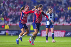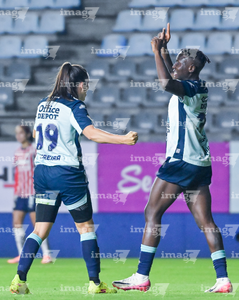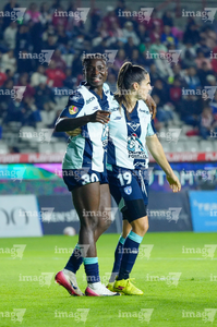 Pachuca, Hidalgo, 19 de octubre de 2025. Andrea Pereira y Chinwendu Ihezuo en festejo de gol, durante el partido correspondiente a la jornada 16 del torneo Apertura 2025 de la Liga BBVA MX Femenil, entre las Tuzas del Pachuca y las Chivas Rayadas del Guadalajara, realizado en el estadio Hidalgo. Foto: Imago7/ Mauricio Ruiz