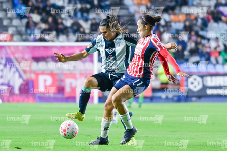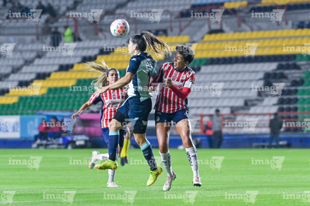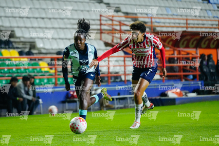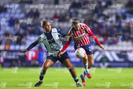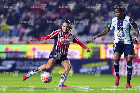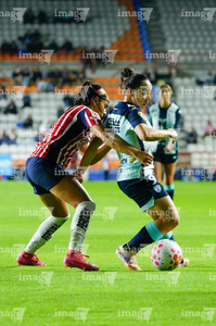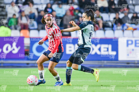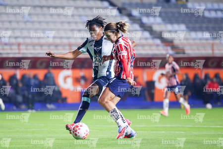 Pachuca, Hidalgo, 19 de octubre de 2025. Carmen Lopez y Esthefanny Barreras, durante el partido correspondiente a la jornada 16 del torneo Apertura 2025 de la Liga BBVA MX Femenil, entre las Tuzas del Pachuca y las Chivas Rayadas del Guadalajara, realizado en el estadio Hidalgo. Foto: Imago7/ Jacqueline Pedraza