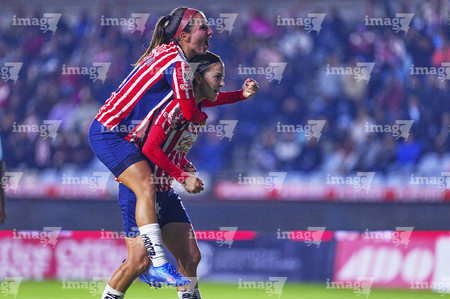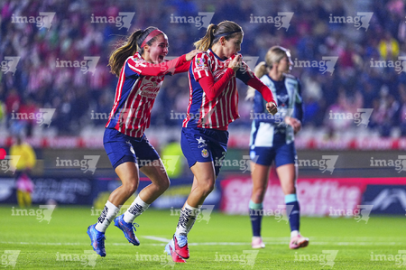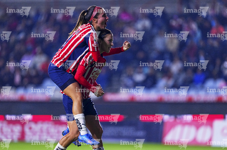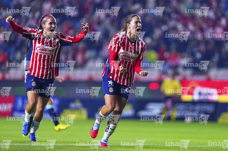 Pachuca, Hidalgo, 19 de octubre de 2025. Jocelyn Orejel y Charlyn Corral en festejo de gol, durante el partido correspondiente a la jornada 16 del torneo Apertura 2025 de la Liga BBVA MX Femenil, entre las Tuzas del Pachuca y las Chivas Rayadas del Guadalajara, realizado en el estadio Hidalgo. Foto: Imago7/ Jacqueline Pedraza