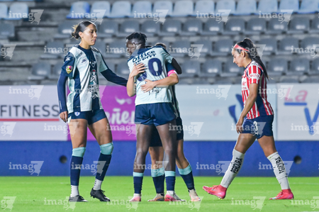 Pachuca, Hidalgo, 19 de octubre de 2025. Chinwendu Ihezuo y Andrea Pereira en festejo de gol, durante el partido correspondiente a la jornada 16 del torneo Apertura 2025 de la Liga BBVA MX Femenil, entre las Tuzas del Pachuca y las Chivas Rayadas del Guadalajara, realizado en el estadio Hidalgo. Foto: Imago7/ Jacqueline Pedraza