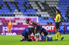 Pachuca, Hidalgo, 19 de octubre de 2025. Carolina Jaramillo resulto lesionada, durante el partido correspondiente a la jornada 16 del torneo Apertura 2025 de la Liga BBVA MX Femenil, entre las Tuzas del Pachuca y las Chivas Rayadas del Guadalajara, realizado en el estadio Hidalgo. Foto: Imago7/ Manlio Contreras