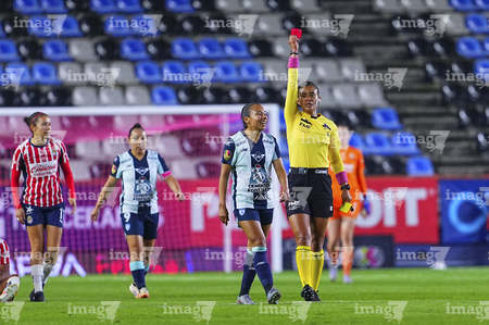 Pachuca, Hidalgo, 19 de octubre de 2025. Itzel Hernández Fuentes, árbitra central muestra tarjeta roja de expulsión, durante el partido correspondiente a la jornada 16 del torneo Apertura 2025 de la Liga BBVA MX Femenil, entre las Tuzas del Pachuca y las Chivas Rayadas del Guadalajara, realizado en el estadio Hidalgo. Foto: Imago7/ Manlio Contreras