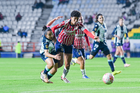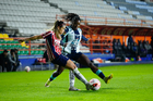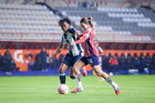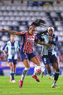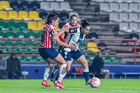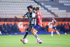 Pachuca, Hidalgo, 19 de octubre de 2025. Andrea Pereira y Casandra Montero, durante el partido correspondiente a la jornada 16 del torneo Apertura 2025 de la Liga BBVA MX Femenil, entre las Tuzas del Pachuca y las Chivas Rayadas del Guadalajara, realizado en el estadio Hidalgo. Foto: Imago7/ Mauricio Ruiz